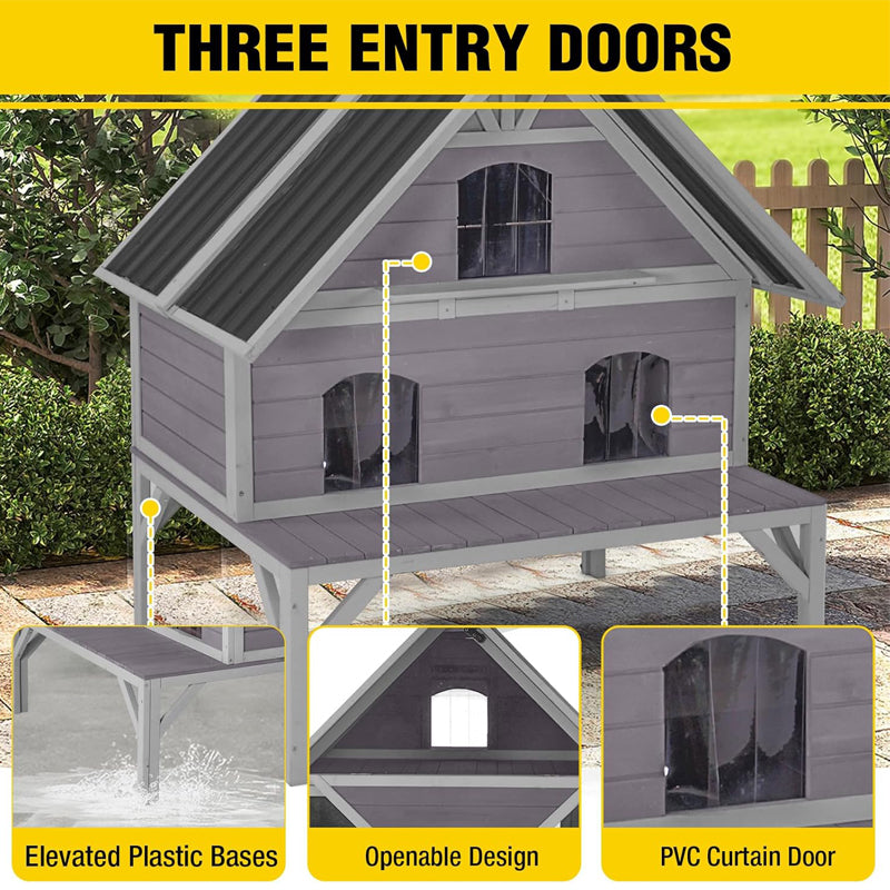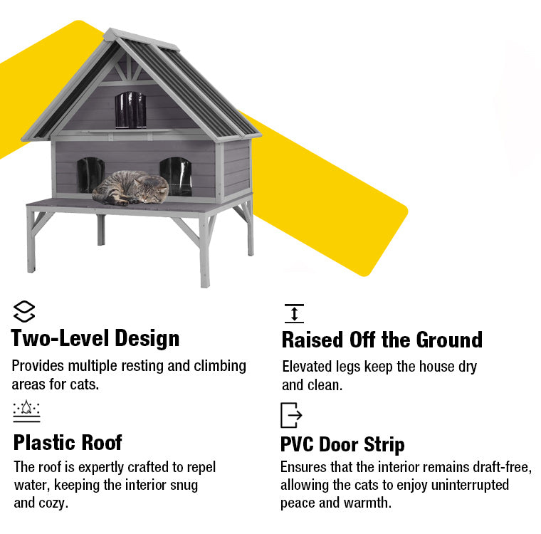 Give your cats a safe, cozy outdoor retreat with this durable wooden cat house. Built with a weather-resistant metal roof and raised legs, it keeps pets dry and comfortable in all seasons. The two-level design offers ample space for climbing, resting, and observing, while the PVC door flap provides easy access and protection from wind or rain. Perfect for outdoor use, this cat shelter combines functionality, comfort, and durability in one stylish design.