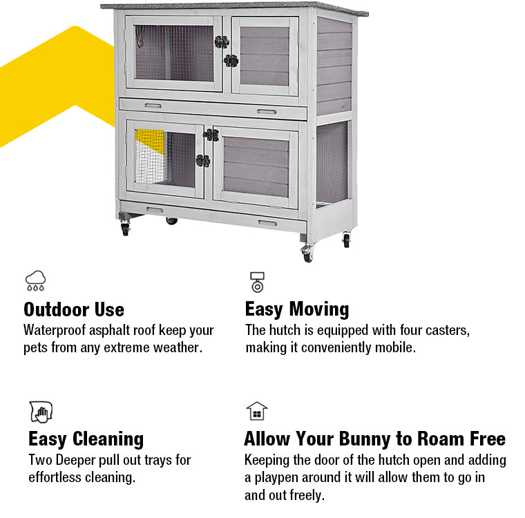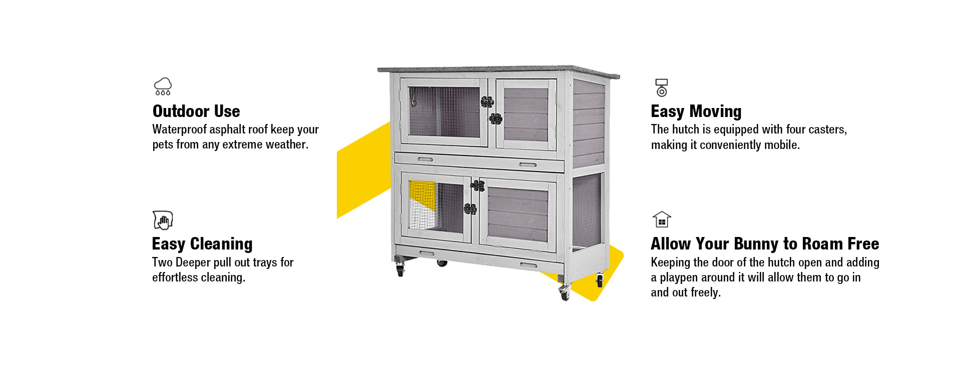 • Four Wheels-Bunny hutch with four wheels for quickly move. And two wheels are brake casters to fix and keep your rabbits safe.