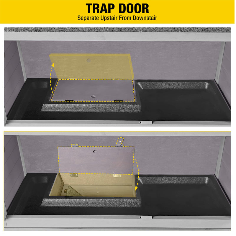 • Two Separate Levels-There is a simple wooden door between the two sections, you can put it down to separate two floors, or the pets get to explore upstairs and downstairs by ramp between two areas.
